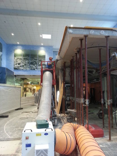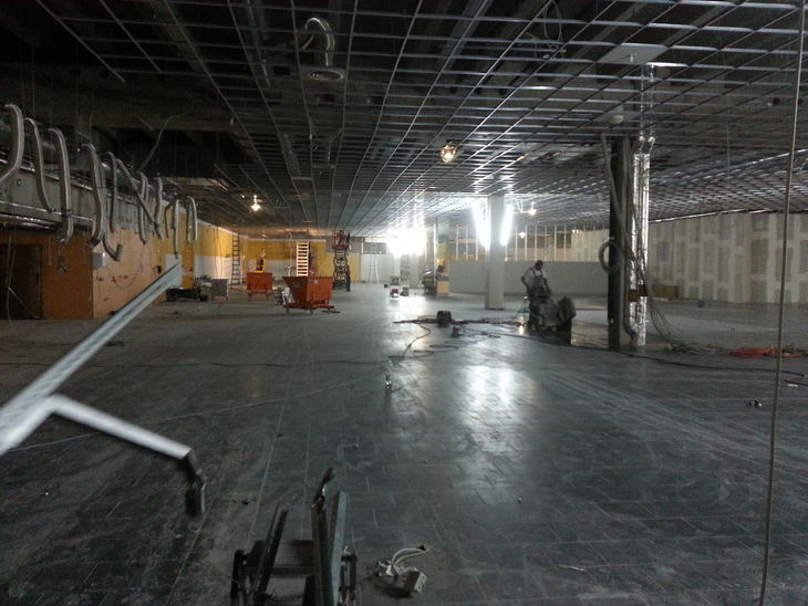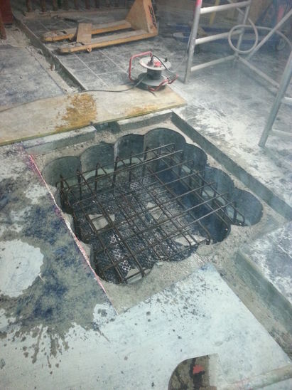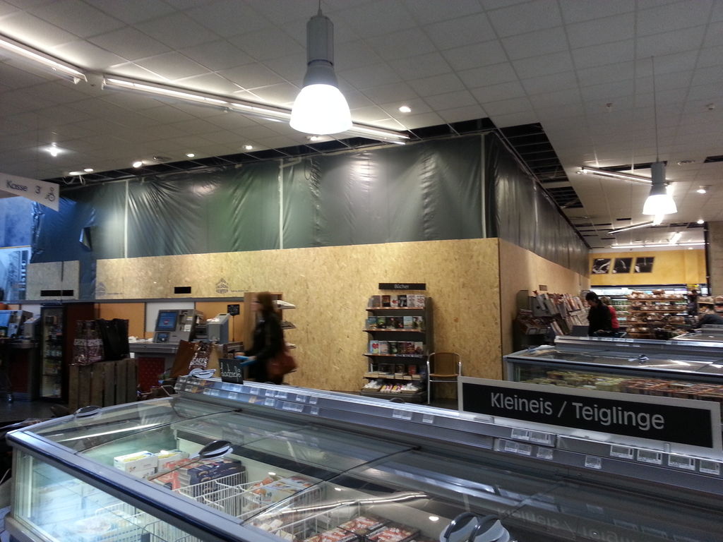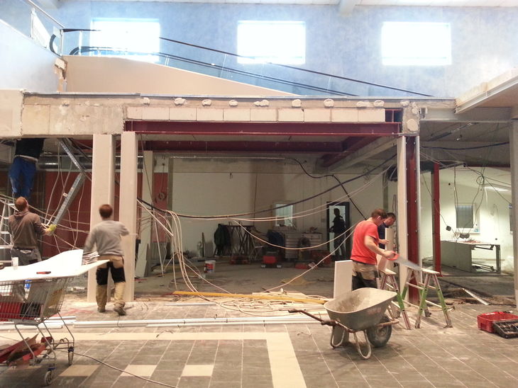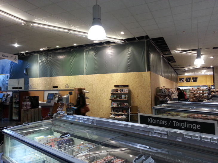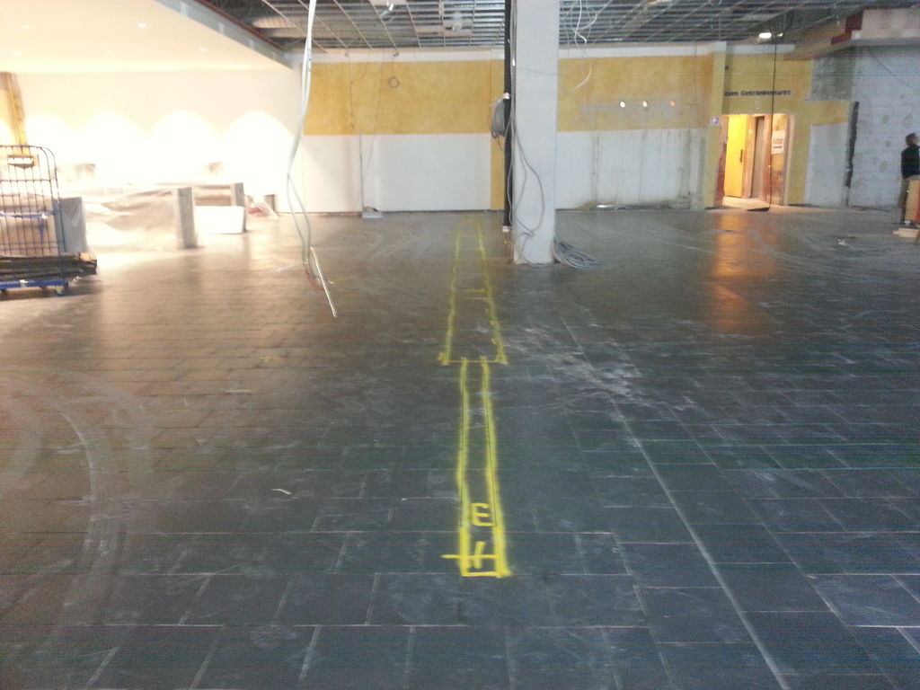 Zu den von uns ausgeführten Arbeiten gehörten unter anderem der Rückbau der gesamten Ladeneinrichtung inklusive der Kühlhäuser für Käse und Fisch sowie der Rückbau tragender Strukturen im Bereich des neuen Bistros. Dort wurden dann etwa 1.5 Tonnen Stahlträger neu eingebaut. Für neue Kühlleitungen haben wir zahlreiche Bodenschlitze hergestellt.