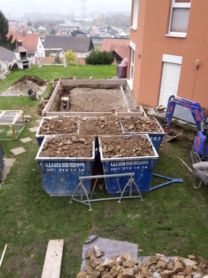 Da das Grundstück am Hang lag und nur über eine 3 m tiefe Stützmauer erreichbar war, mussten wir hier mit Minikontainern Arbeiten.